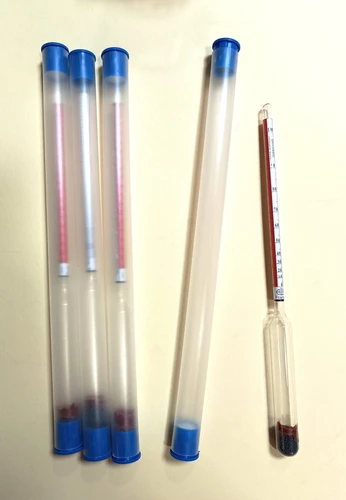 پس از تهیه ظرف مناسب ، مقداری از مایع مورد تست را درون استوانه مدرج یا ظرفی که از قبل برای این آزمایش آماده کرده ایم میریزیم. تاکید میشود ارتفاع مایع حدوداً ۳۰ سانتیمتری باشد. حال به آرامی الکل متر را درون ظرف رها مینمائیم.