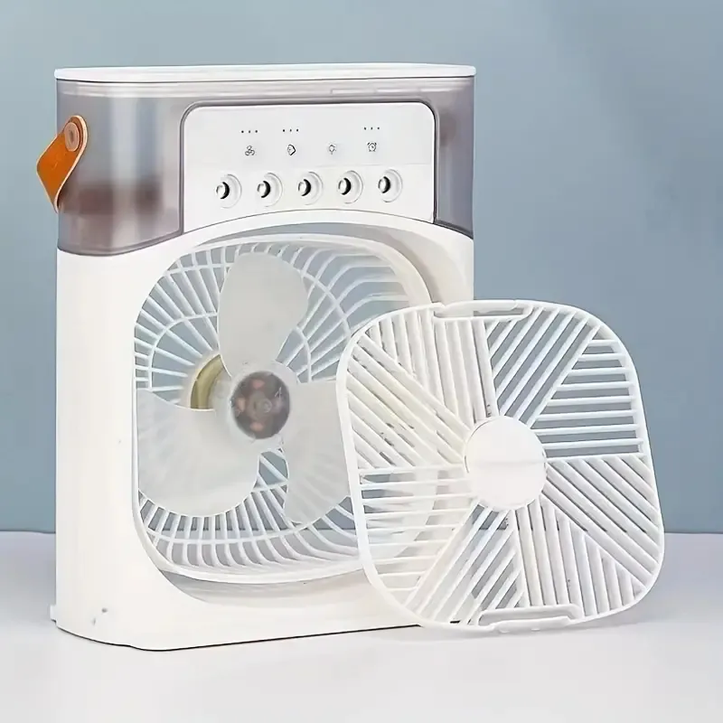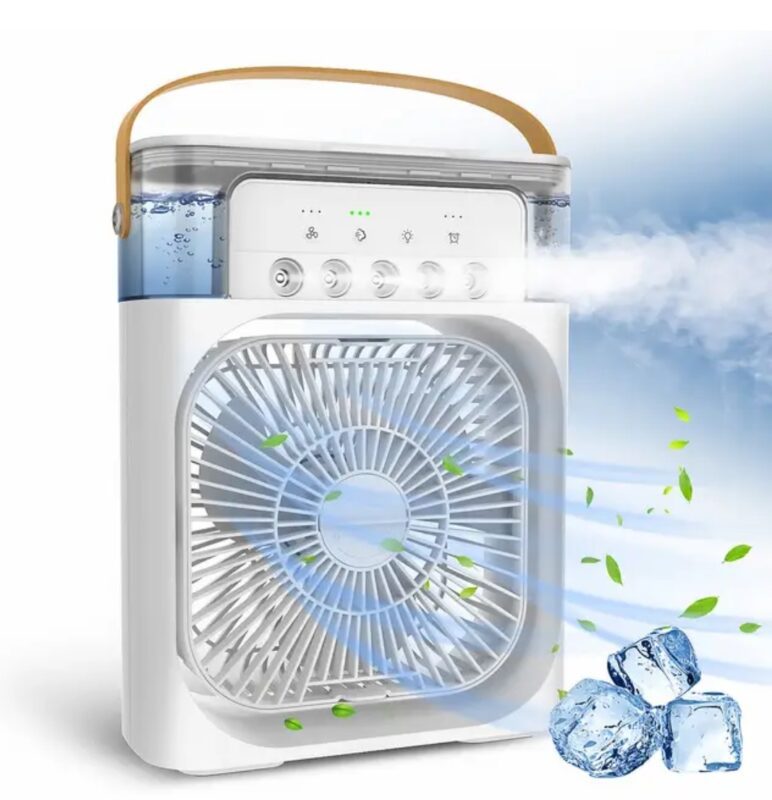 پنکه مه پاش رومیزی مدل Air Cooler Fan فاقد باتری است و به صورت مستقیم توسط آداپتور و کابل USB Type C به برق متصل میشود.و همچنین به وسیله پاور بانک هم میتوانید استفاده کنید . دارای پنج نازل مه پاش قوی و قابلیت تنظیم تعداد مه پاش ها است. دارای پد خوشبو کننده و تایمر جهت خاموشی خودکار می باشد. فن دستگاه قابلیت تنظیم دستی و چرخش ۳۶۰ درجه در یک جهت را دارد و محافظ فن دارای قابلیت باز و بسته شدن جهت نظافت پره ها میباشد. ترجیحا از آب تصفیه شده درون دستگاه استفاده شود جهت جلوگیری از رسوب.